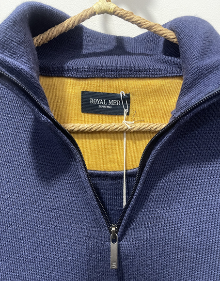 Le pull camionneur Hommes Baudouin en Denim Jaune, allie style classique et originalité avec son col montant zippé et sa lunette intérieure jaune lui donne sa touche mode le cassant de son côté classique. Il est agrémenté du petit Badge au logo ROYAL MER sur le haut bras gauche au porté.