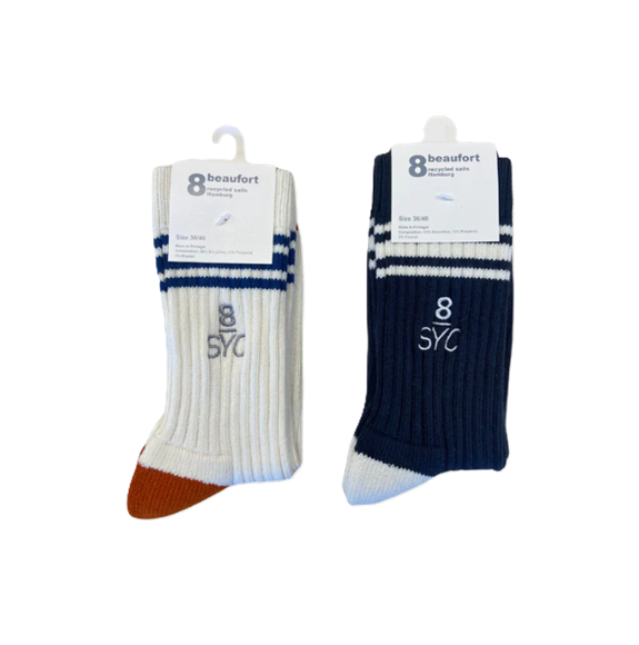 Les chaussettes côtelées en coton biologique de 8beaufort.hamburg offrent un grand confort. Broderie 8SYC de haute qualité sur le côté.