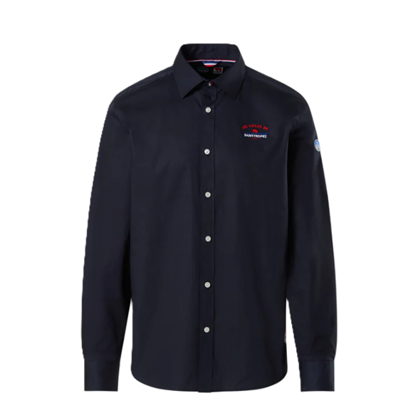 Mettez dans votre look l’allure prestigieuse des Voiles de Saint-Tropez dans vos tenues décontractées avec cette chemise en popeline de coton stretch de North Sails. Dédiée à l’édition 2025 de la régate iconique, elle arbore le logo LVDST brodé sur la poitrine et les coordonnées officielles de l’événement sur la patte intérieure. Assortie d’un col italien facile à assortir. Ce modèle est fabriqué en je jersey de coton stretch, coupe régulière avec col italien. Les ourlets de cette chemise sont arrondis, fermé par 1 petit boutons en haut au drapeau tricolore + 6 petits boutons unis nacrés