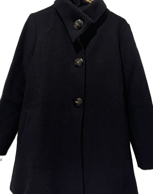 Sa forme trapèze et sa longueur à mi-cuisse en font un manteau particulièrement facile à porter, il se ferme par 3 gros boutons imitation corne + 1 de rappel et pour garder vos mains aux chaud vous avez 2 poches passepoilées